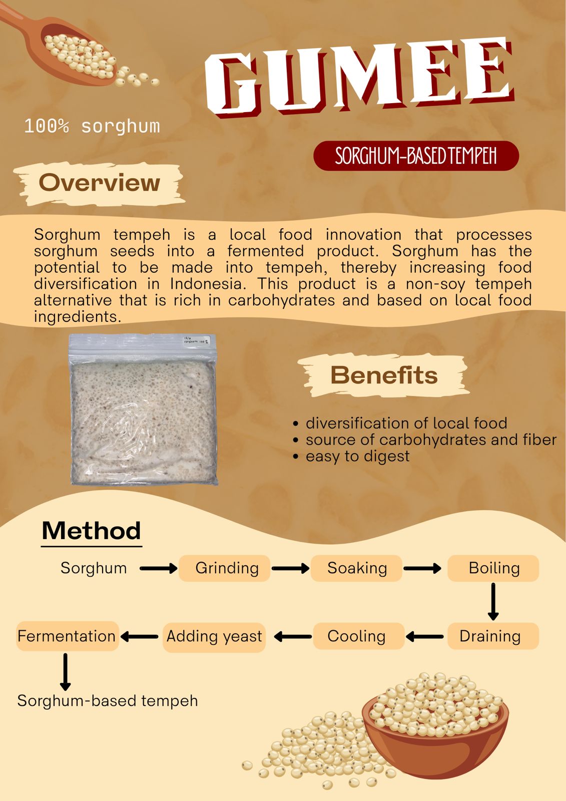 Gumee adalah tempe sorghum hasil inovasi lokal yang mengolah biji sorghum menjadi tempe, melalui fermentasi. Selain jadi alternatif tempe non-kedelai, tempe sorghum kaya akan karbohidrat dan serat, sehingga mudah dicerna.